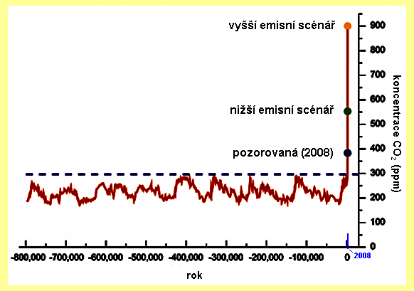 Obrázek znázorňuje koncentrace CO2 za posledních 800 tisíc roků,